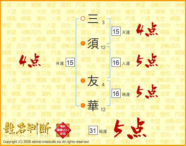 生活面を象徴する運勢です。外部から受ける影響力を表し、結婚運、家庭運や職場、環境への順応性を表します。総運から人運を引いた画数。姓や名が1文字の場合を除く。