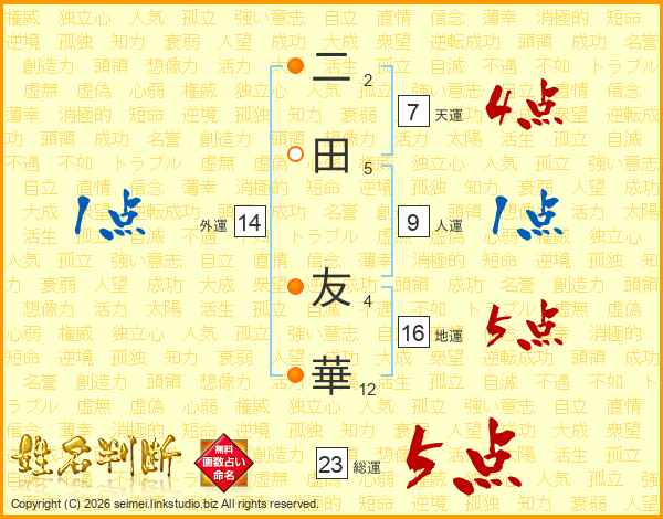 生活面を象徴する運勢です。外部から受ける影響力を表し、結婚運、家庭運や職場、環境への順応性を表します。総運から人運を引いた画数。姓や名が1文字の場合を除く。