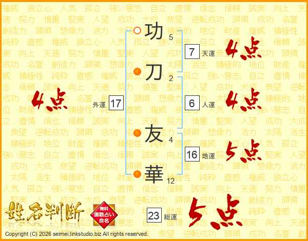 生活面を象徴する運勢です。外部から受ける影響力を表し、結婚運、家庭運や職場、環境への順応性を表します。総運から人運を引いた画数。姓や名が1文字の場合を除く。