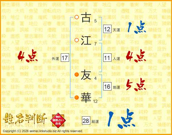 生活面を象徴する運勢です。外部から受ける影響力を表し、結婚運、家庭運や職場、環境への順応性を表します。総運から人運を引いた画数。姓や名が1文字の場合を除く。