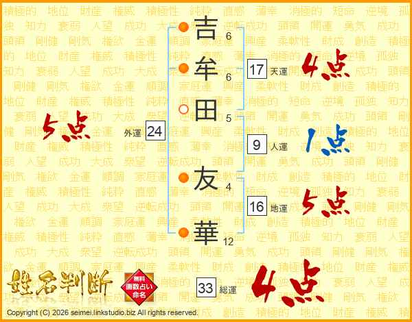 吉(6画)牟(6画)田(5画) 友(4画)華(12画)