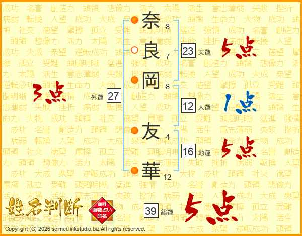 奈(8画)良(7画)岡(8画) 友(4画)華(12画)