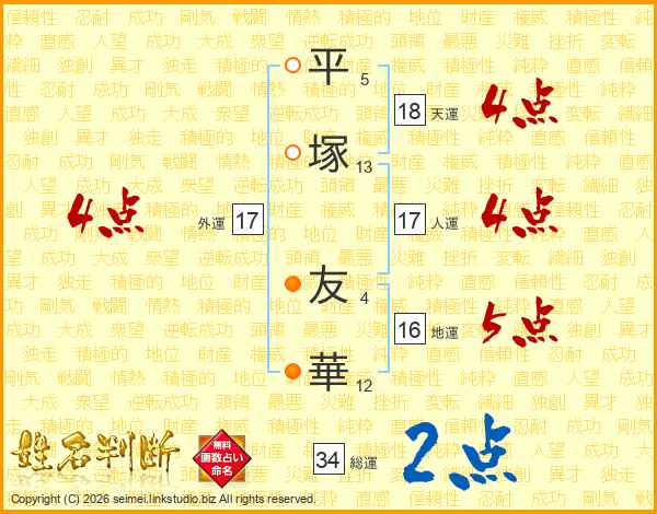 あなたの人生を表す1番重要な運勢です。生涯を通じて影響する総合運となり、主に50歳以降の晩年期に影響を及ぼします。苗字と名前の合計画数。