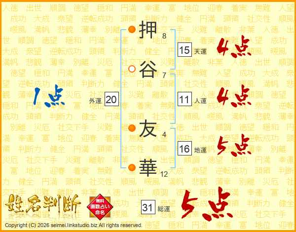 生活面を象徴する運勢です。外部から受ける影響力を表し、結婚運、家庭運や職場、環境への順応性を表します。総運から人運を引いた画数。姓や名が1文字の場合を除く。