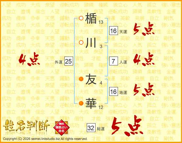 生活面を象徴する運勢です。外部から受ける影響力を表し、結婚運、家庭運や職場、環境への順応性を表します。総運から人運を引いた画数。姓や名が1文字の場合を除く。
