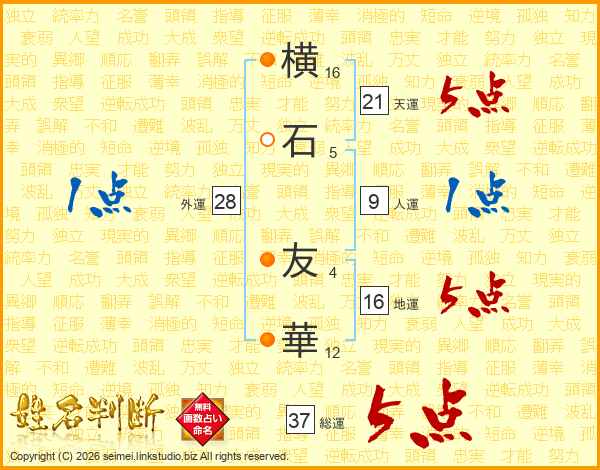 生活面を象徴する運勢です。外部から受ける影響力を表し、結婚運、家庭運や職場、環境への順応性を表します。総運から人運を引いた画数。姓や名が1文字の場合を除く。