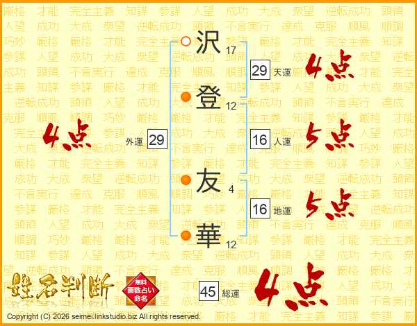 あなたの人生を表す1番重要な運勢です。生涯を通じて影響する総合運となり、主に50歳以降の晩年期に影響を及ぼします。苗字と名前の合計画数。