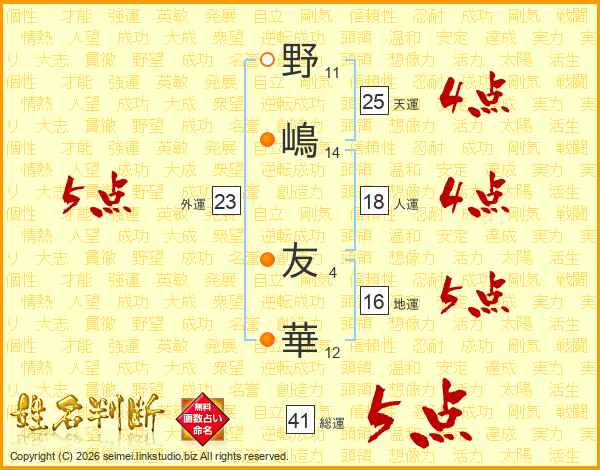 野(11画)嶋(14画) 友(4画)華(12画)