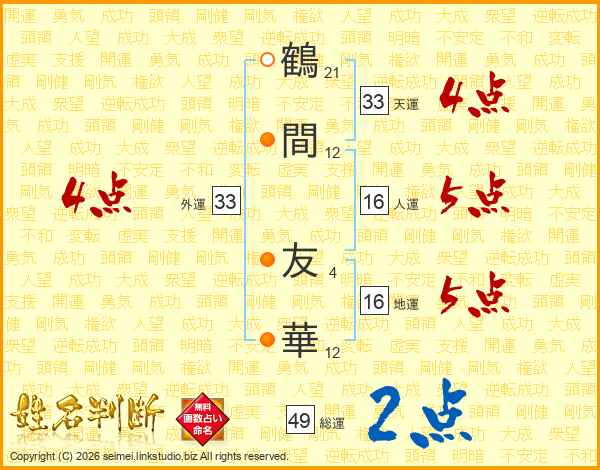 生活面を象徴する運勢です。外部から受ける影響力を表し、結婚運、家庭運や職場、環境への順応性を表します。総運から人運を引いた画数。姓や名が1文字の場合を除く。