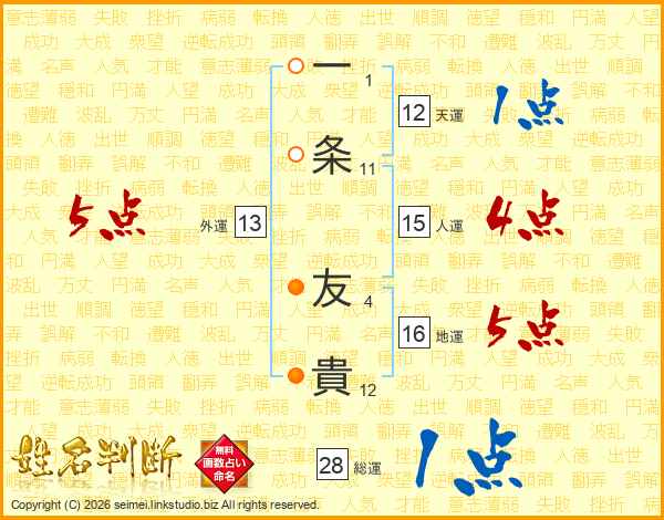 あなたの人生を表す1番重要な運勢です。生涯を通じて影響する総合運となり、主に50歳以降の晩年期に影響を及ぼします。苗字と名前の合計画数。