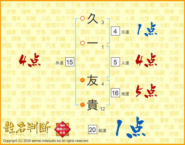 生活面を象徴する運勢です。外部から受ける影響力を表し、結婚運、家庭運や職場、環境への順応性を表します。総運から人運を引いた画数。姓や名が1文字の場合を除く。