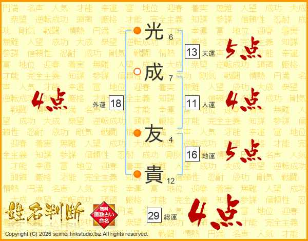 光(6画)成(7画) 友(4画)貴(12画)