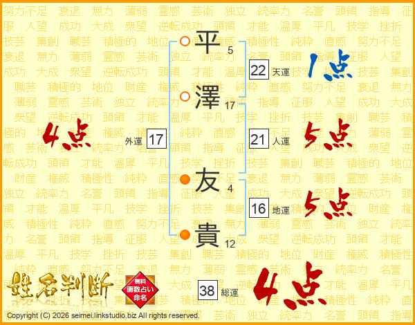 平(5画)澤(17画) 友(4画)貴(12画)
