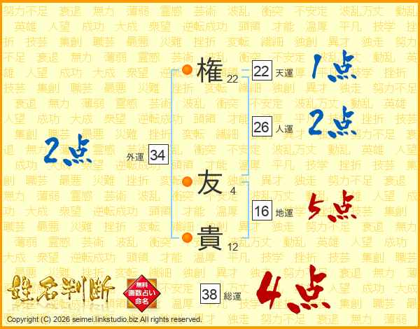 権(22画) 友(4画)貴(12画)