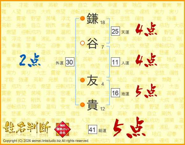 鎌(18画)谷(7画) 友(4画)貴(12画)