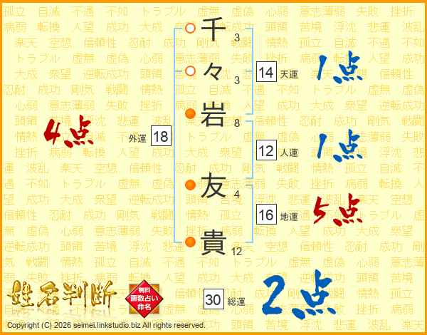千(3画)々(3画)岩(8画) 友(4画)貴(12画)