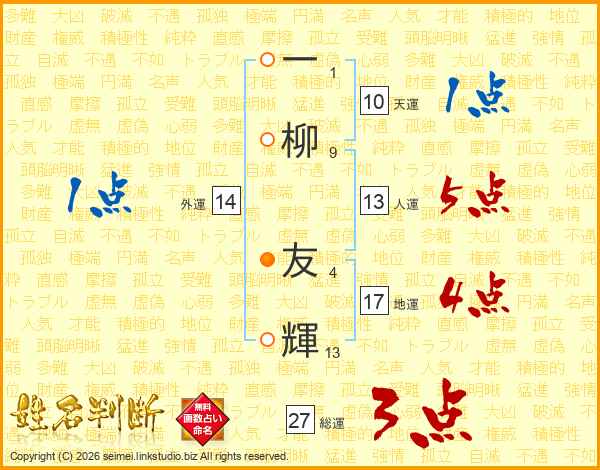 生活面を象徴する運勢です。外部から受ける影響力を表し、結婚運、家庭運や職場、環境への順応性を表します。総運から人運を引いた画数。姓や名が1文字の場合を除く。