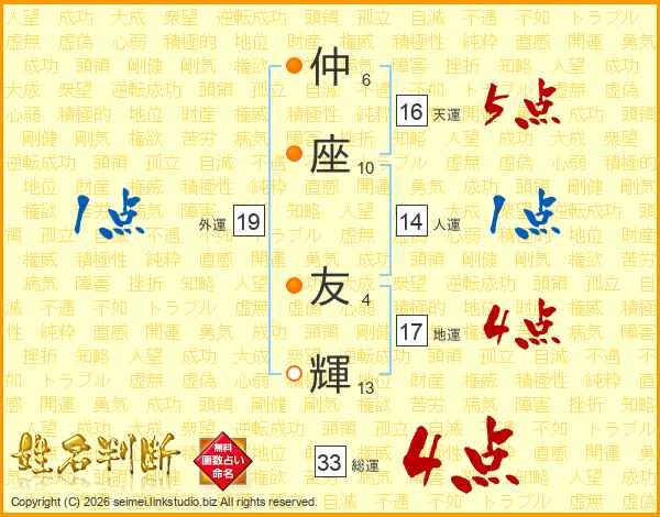 仲(6画)座(10画) 友(4画)輝(13画)