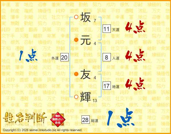 坂(7画)元(4画) 友(4画)輝(13画)