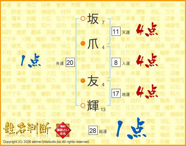 坂爪友輝さんの天運は11画の4点!
