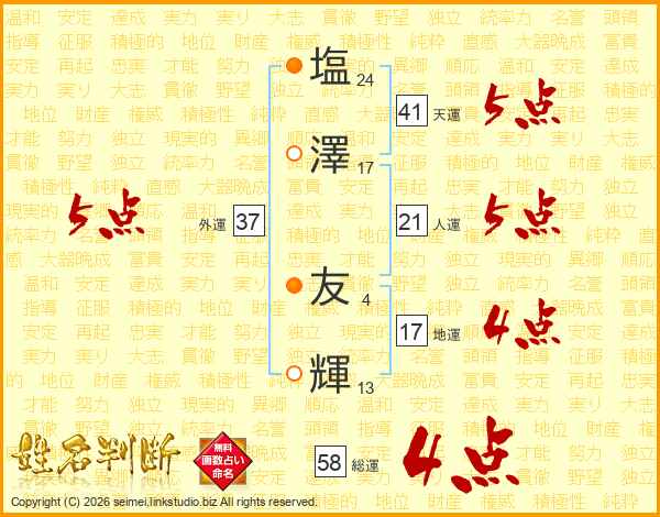 塩(24画)澤(17画) 友(4画)輝(13画)