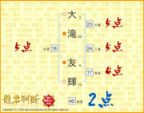 大滝友輝さんの人運は24画の5点!