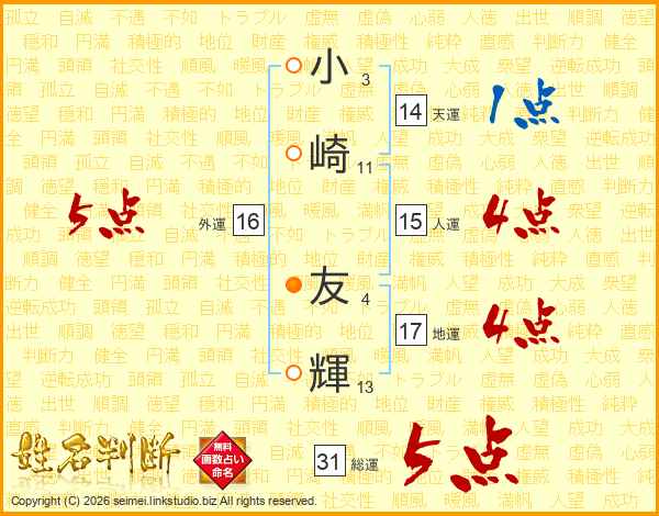 小(3画)崎(11画) 友(4画)輝(13画)