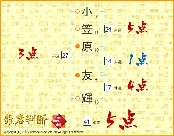 小(3画)笠(11画)原(10画) 友(4画)輝(13画)