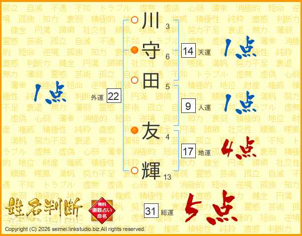 川(3画)守(6画)田(5画) 友(4画)輝(13画)