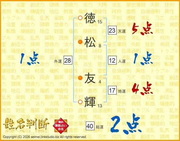 徳(15画)松(8画) 友(4画)輝(13画)