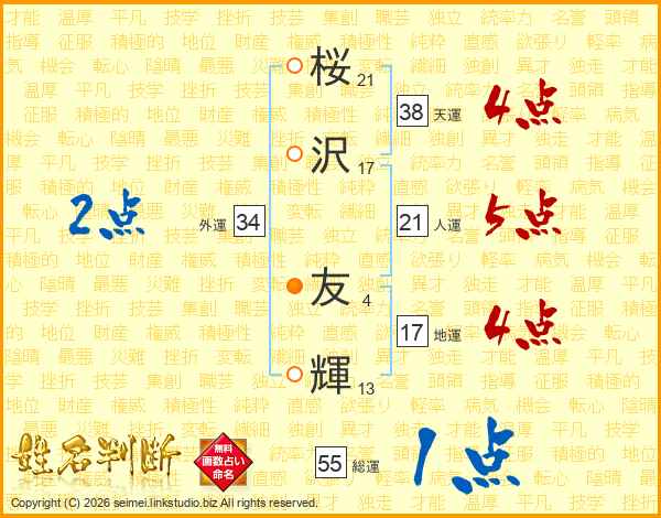 桜(21画)沢(17画) 友(4画)輝(13画)