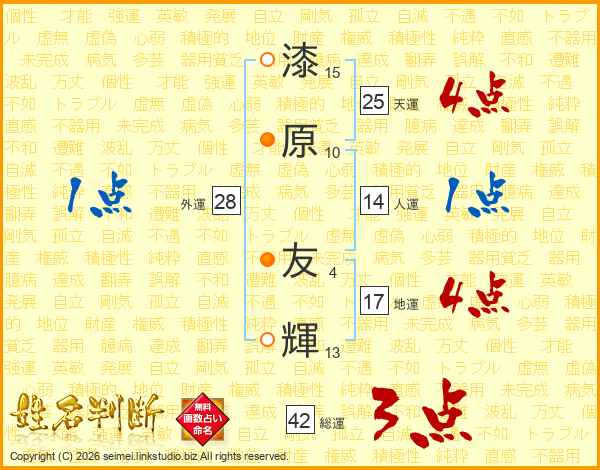生活面を象徴する運勢です。外部から受ける影響力を表し、結婚運、家庭運や職場、環境への順応性を表します。総運から人運を引いた画数。姓や名が1文字の場合を除く。