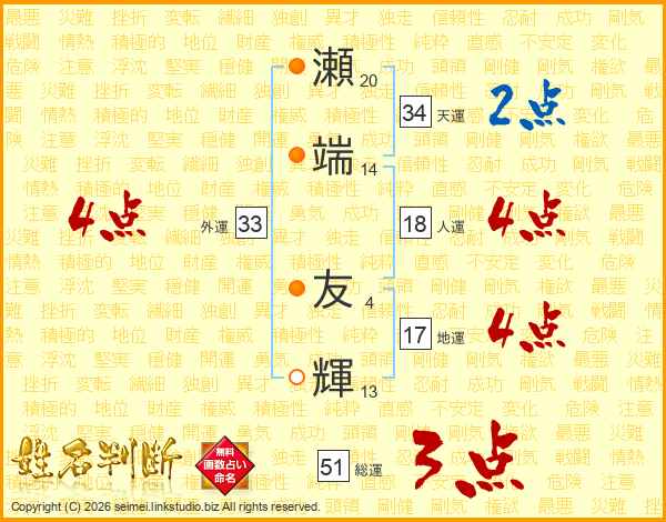 瀬(20画)端(14画) 友(4画)輝(13画)