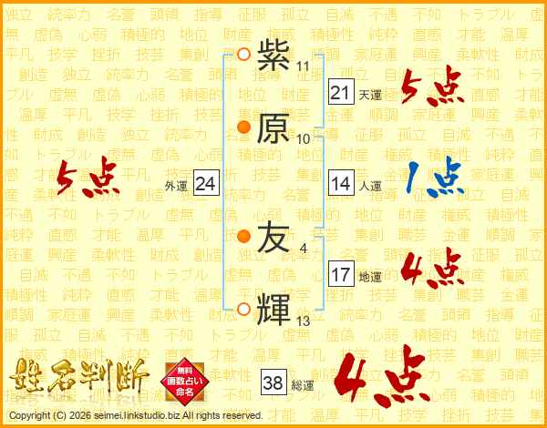 紫(11画)原(10画) 友(4画)輝(13画)