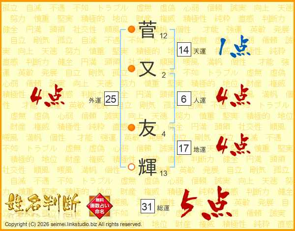 菅(12画)又(2画) 友(4画)輝(13画)