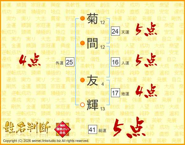 菊(12画)間(12画) 友(4画)輝(13画)