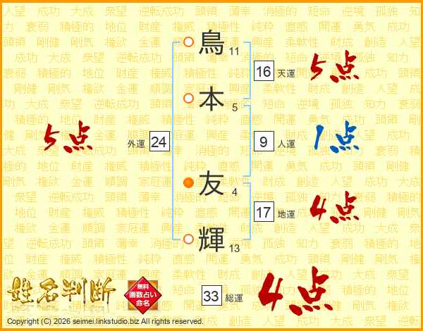 鳥本友輝さんの総運は33画の4点!