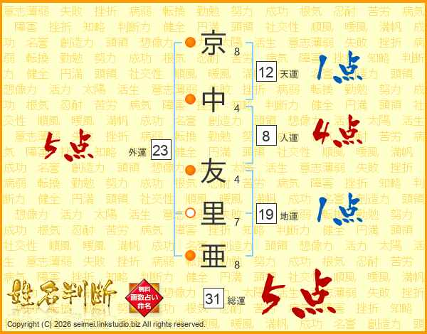 京(8画)中(4画) 友(4画)里(7画)亜(8画)