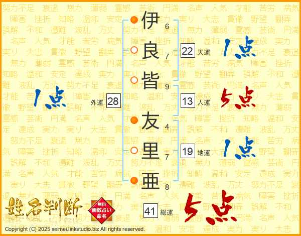 伊(6画)良(7画)皆(9画) 友(4画)里(7画)亜(8画)