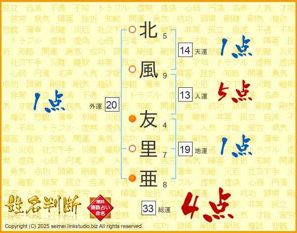 北(5画)風(9画) 友(4画)里(7画)亜(8画)