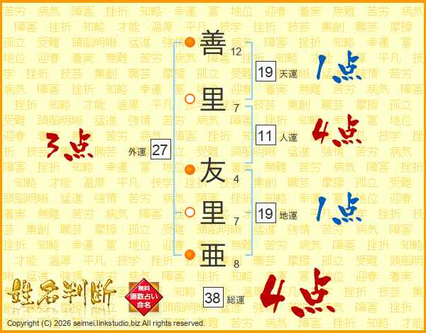 善里友里亜さんの総運は38画の4点!