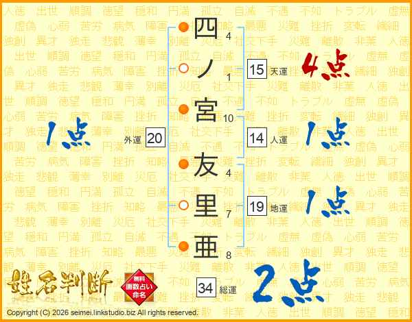 四ノ宮友里亜さんの総運は34画の2点!