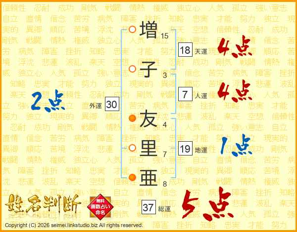 増(15画)子(3画) 友(4画)里(7画)亜(8画)