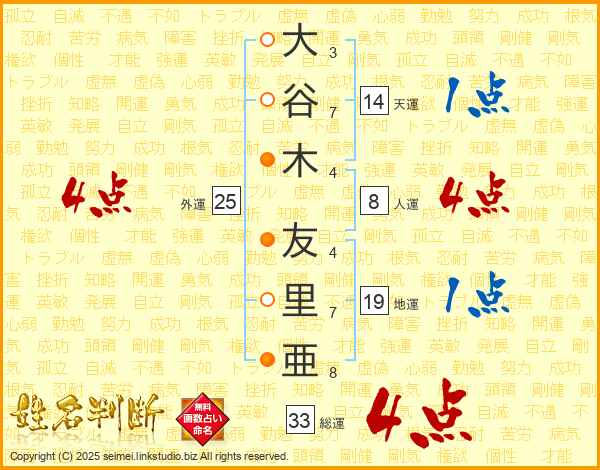 大(3画)谷(7画)木(4画) 友(4画)里(7画)亜(8画)