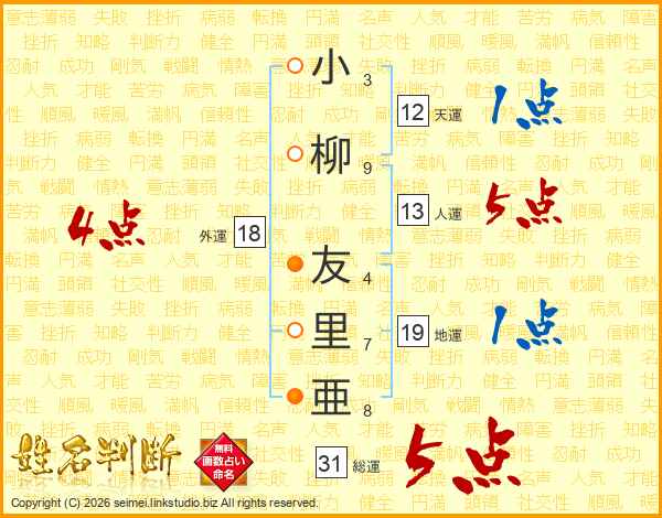 小柳友里亜さんの総運は31画の5点!