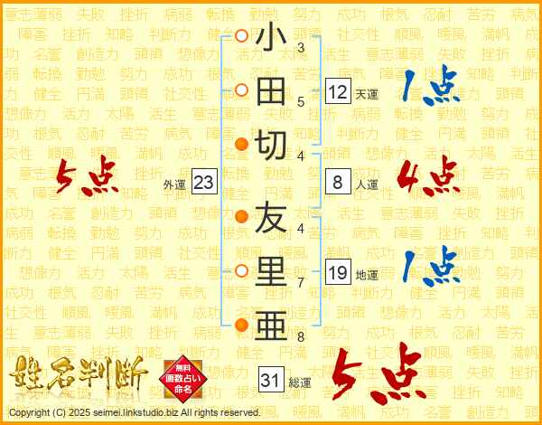 小(3画)田(5画)切(4画) 友(4画)里(7画)亜(8画)