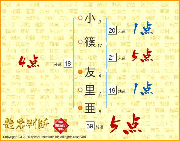 小篠友里亜さんの総運は39画の5点!