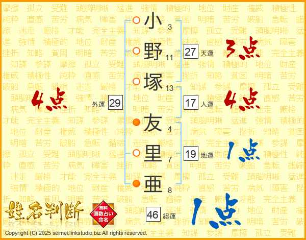 小(3画)野(11画)塚(13画) 友(4画)里(7画)亜(8画)