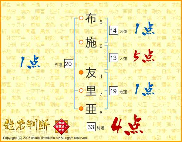 布(5画)施(9画) 友(4画)里(7画)亜(8画)