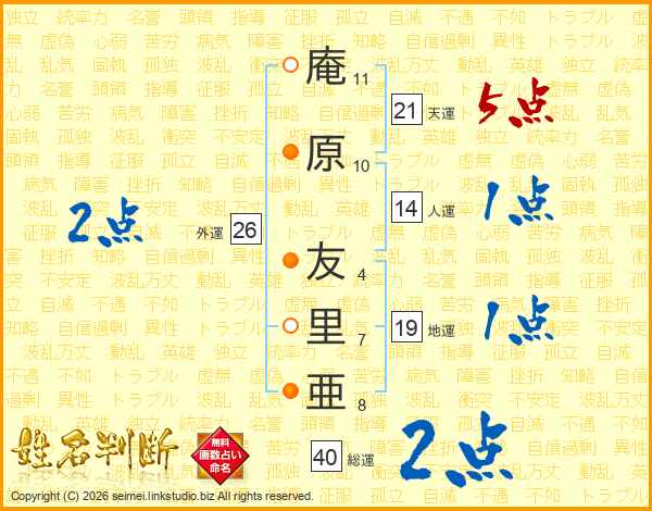 庵(11画)原(10画) 友(4画)里(7画)亜(8画)